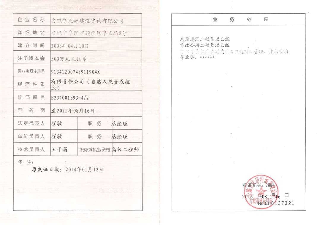 2014年1月取得工程監(jiān)理資質(zhì)證書;現(xiàn)工程招標(biāo)代理及工程造價(jià)已取得甲級(jí)資質(zhì),并開展了環(huán)境影響評(píng)價(jià)、工程測(cè)量、房地產(chǎn)評(píng)估等業(yè)務(wù)。